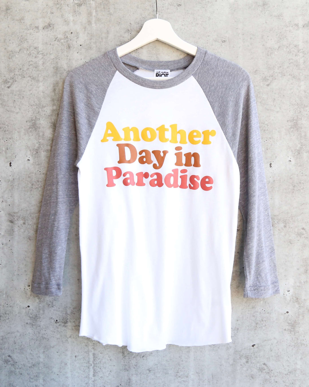 This retro baseball style 3/4 sleeved t-shirt with "Another Day In Paradise" graphic is perfect for an everyday comfy look. Pair this baseball tee with any bottoms and slip on shoes.