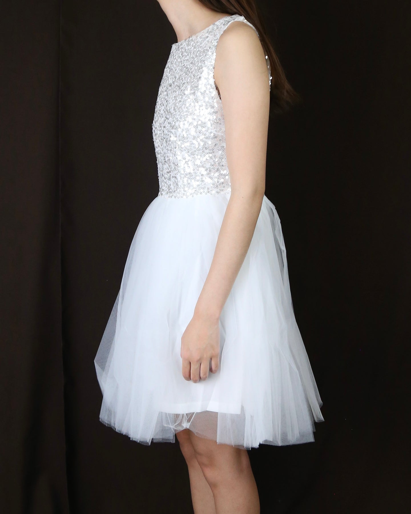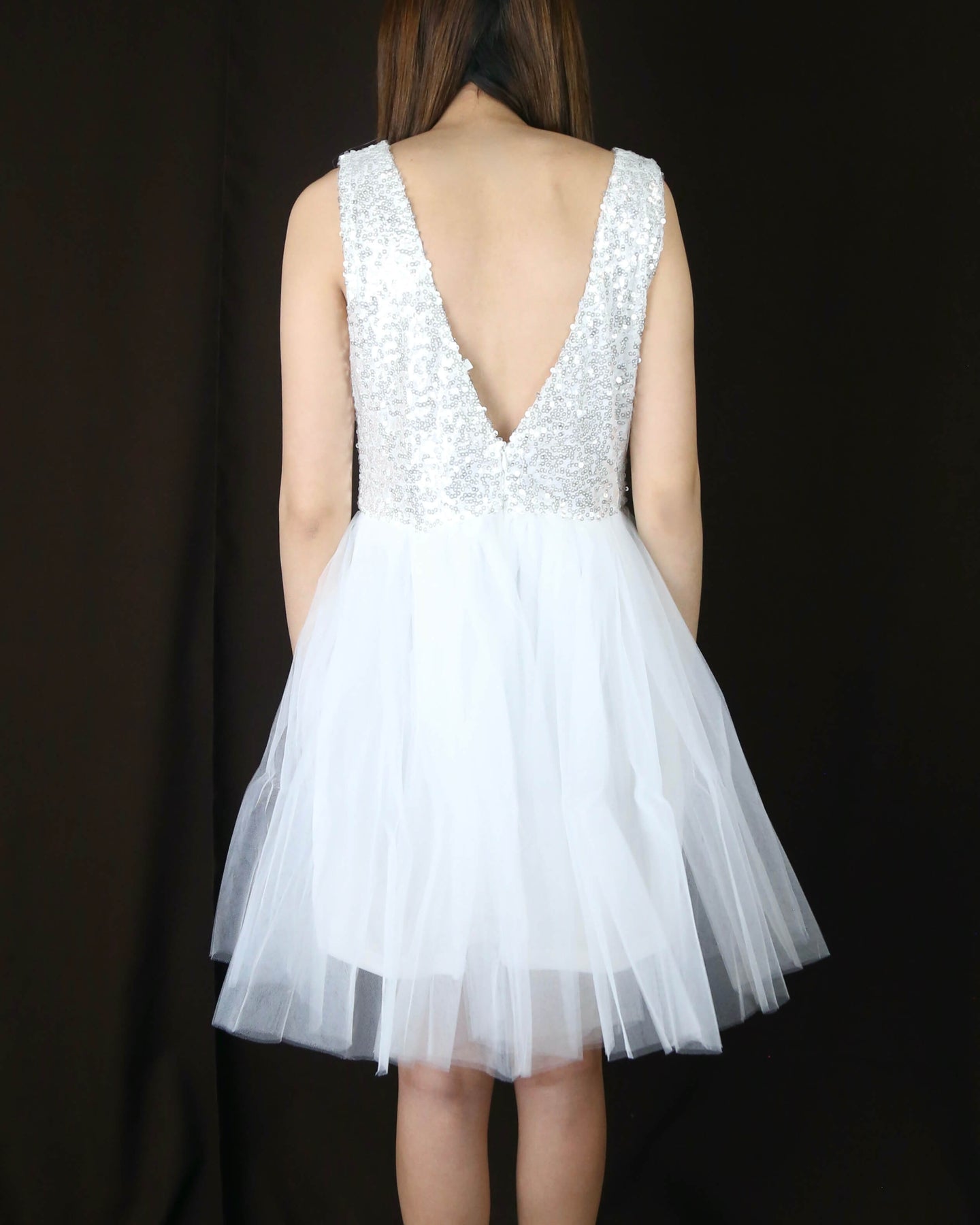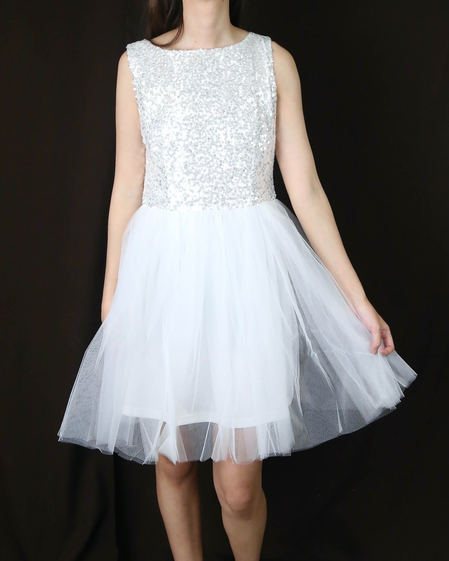 Beautiful dazzling black sequins adorn this ballerina style tulle bottom black dress. A darling dress for any special occasion. Perfect for prom, homecoming, birthday party, and other special events.