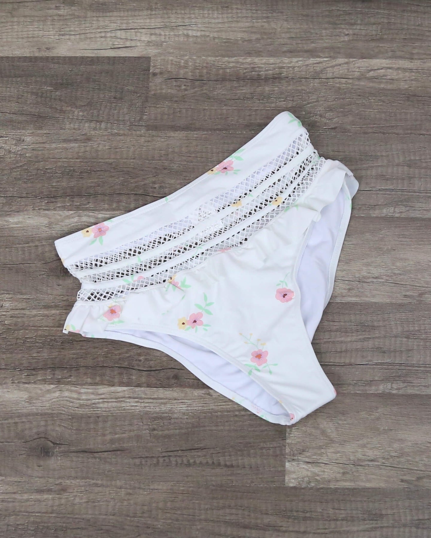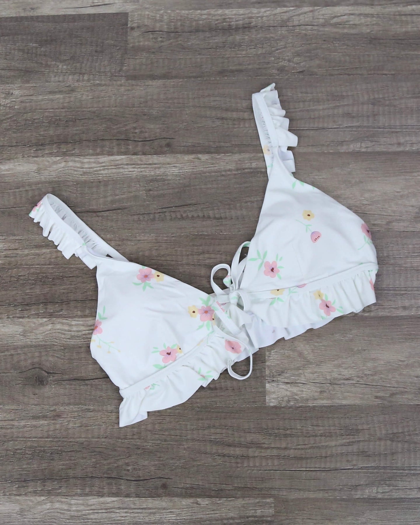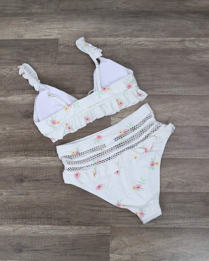 This bikini is super cute and perfect for the girl next door look! Featuring a top with ruffle hem, removable pads, adjustable shoulder straps and front tie closure along with a high waist bottom with ruffle trim and mesh details, this bikini gives a flirty vibe!