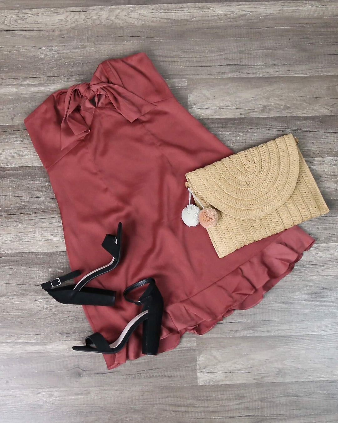 The perfect dress for date night! This strapless satin mini dress features a sweetheart neckline, front tie accents, and a ruffle trim. Pair this dress with some heels, which can also be perfect for an everyday look.