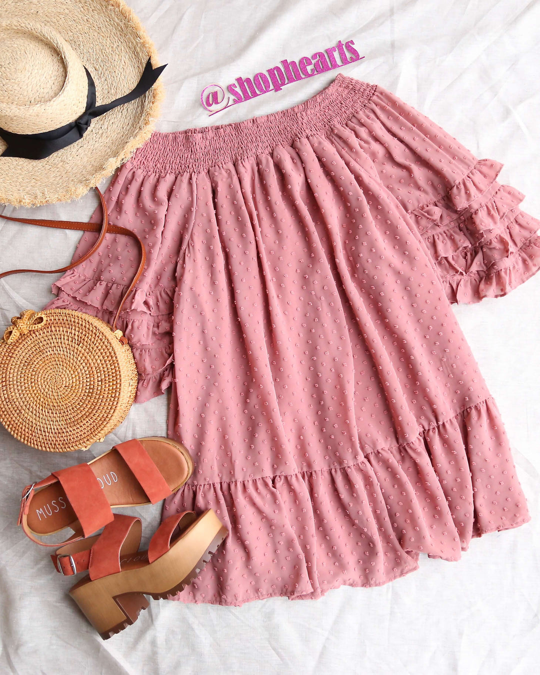 This gorgeous off-the-shoulder tunic dress with a swiss dot pattern and ruffles is perfect for the spring or summer seasons. Pair this with your favorite pair of heels for a casual and cute look!