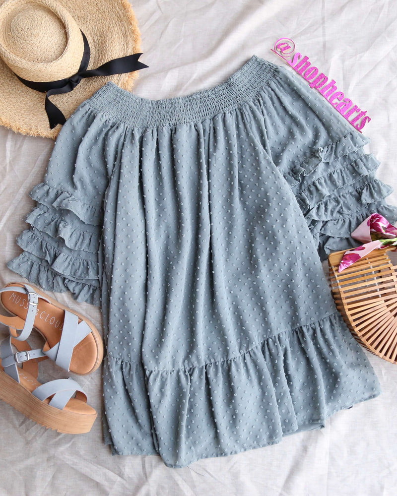 This gorgeous off-the-shoulder tunic dress with a swiss dot pattern and ruffles is perfect for the spring or summer seasons. Pair this with your favorite pair of heels for a casual and cute look!