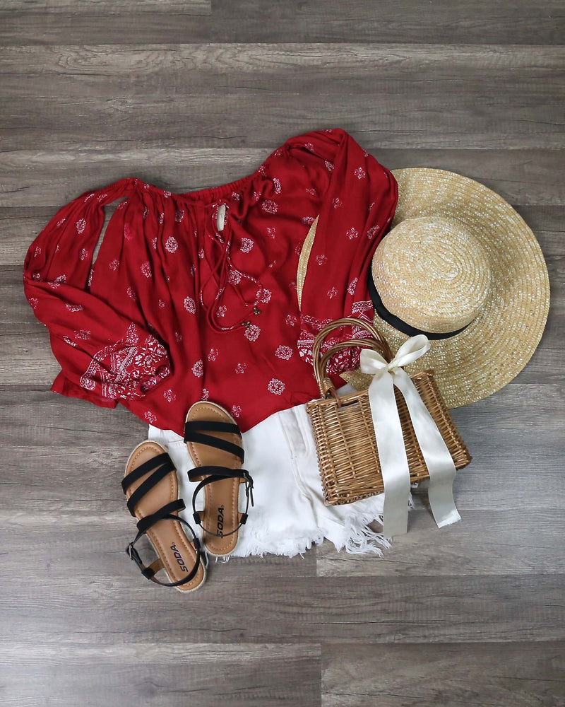 • Off-the-shoulder drawstring neckline and long sleeves.