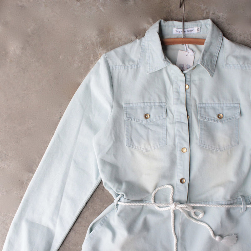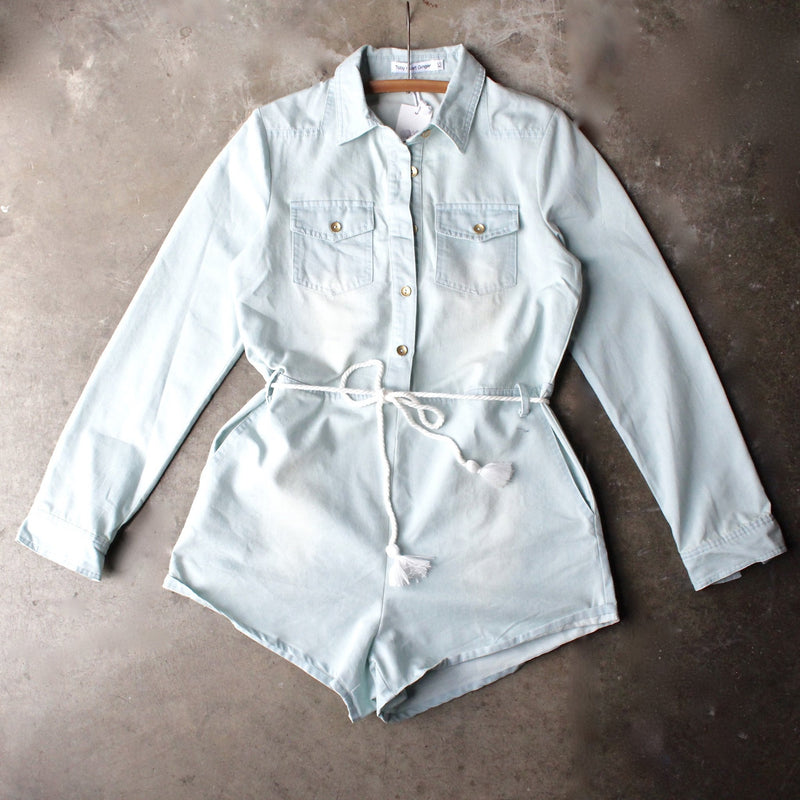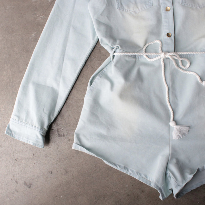 This amazing romper features a quality denim fabric, faded wash design, two front pockets, and a belt sash.