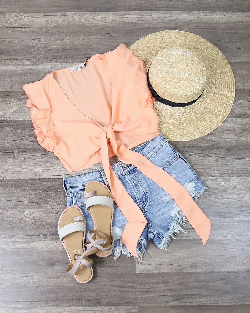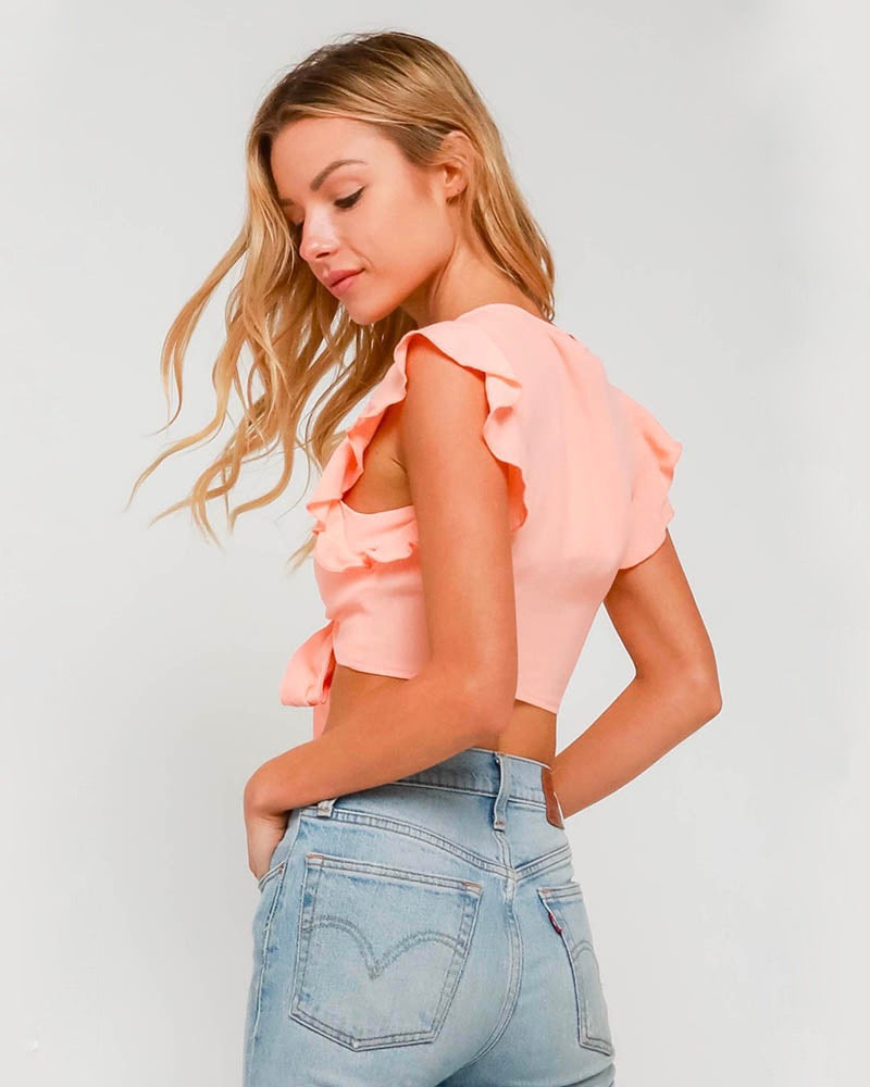 Nothing screams summer like the cutest crop tops! This adorable crop top features a waist tie, ruffle sleeves, and a deep v-neck for a sweetheart feel. Wear this piece with your favorite high waisted jeans or shorts and sneakers for a super cute girl next door outfit!