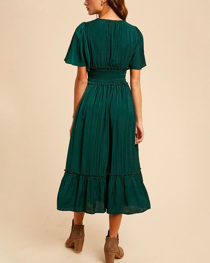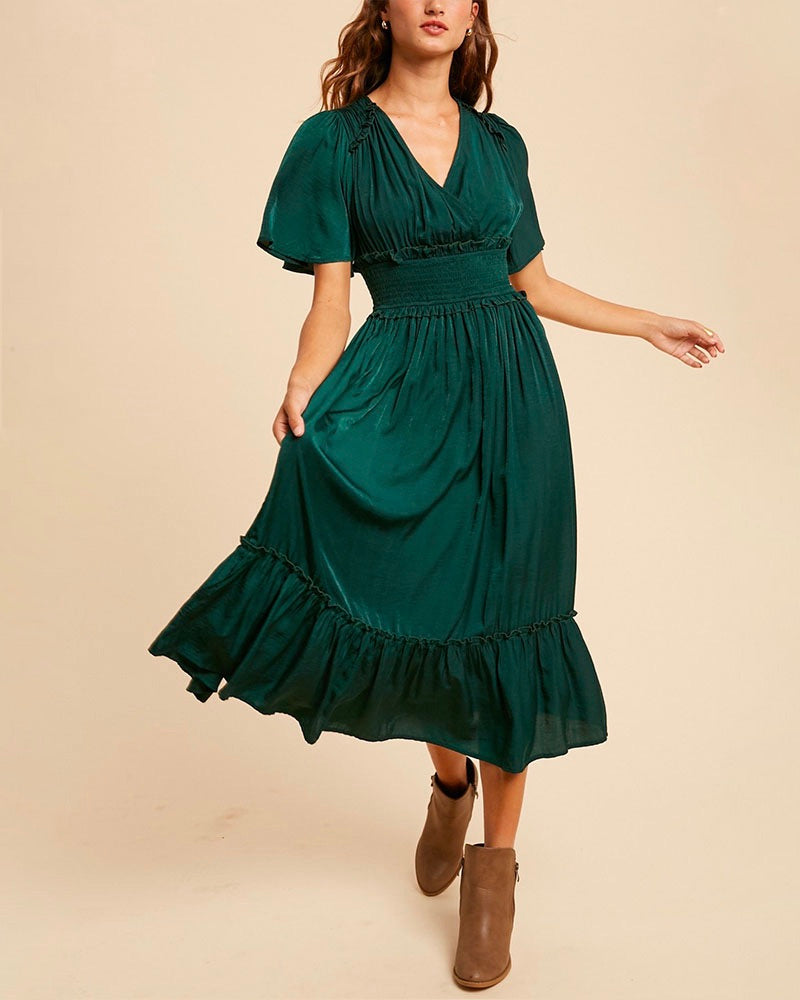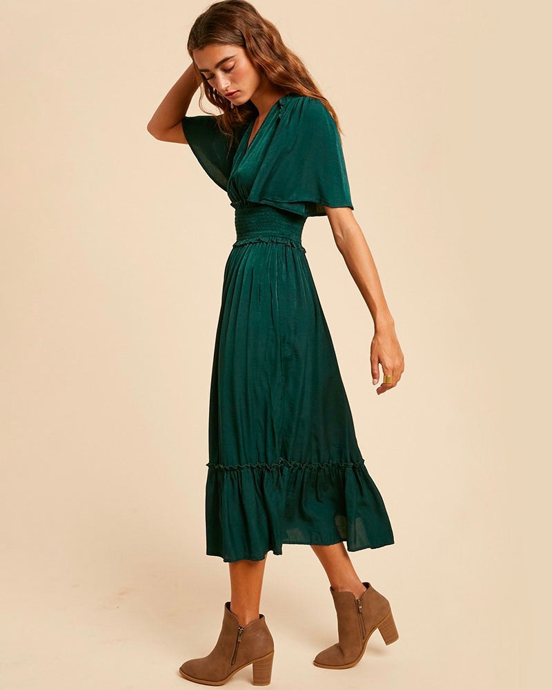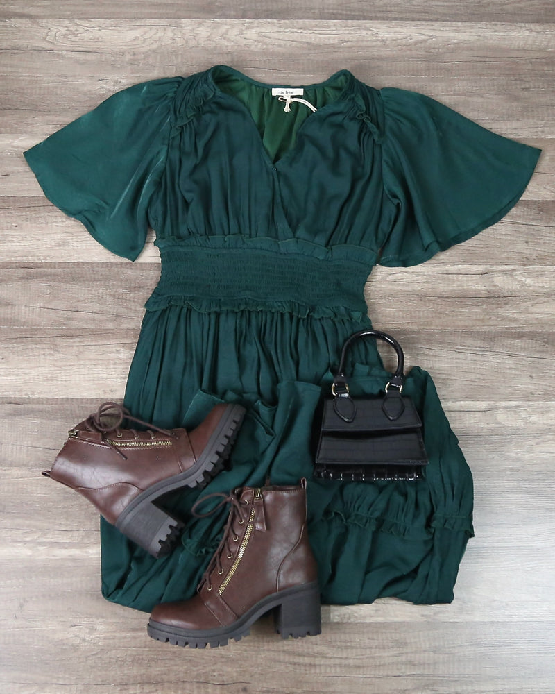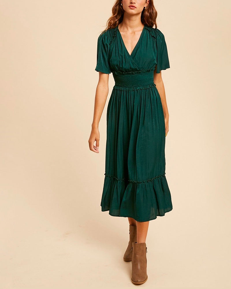 This midi dress is perfect for the boho look, featuring a washed satin fabric, ruffled smocked bodice, surplice wrap neckline, ruffled tiered hem, flutter sleeves, and ruffled shoulders! Pair this dress with some ankle booties and a hat for a cute look.