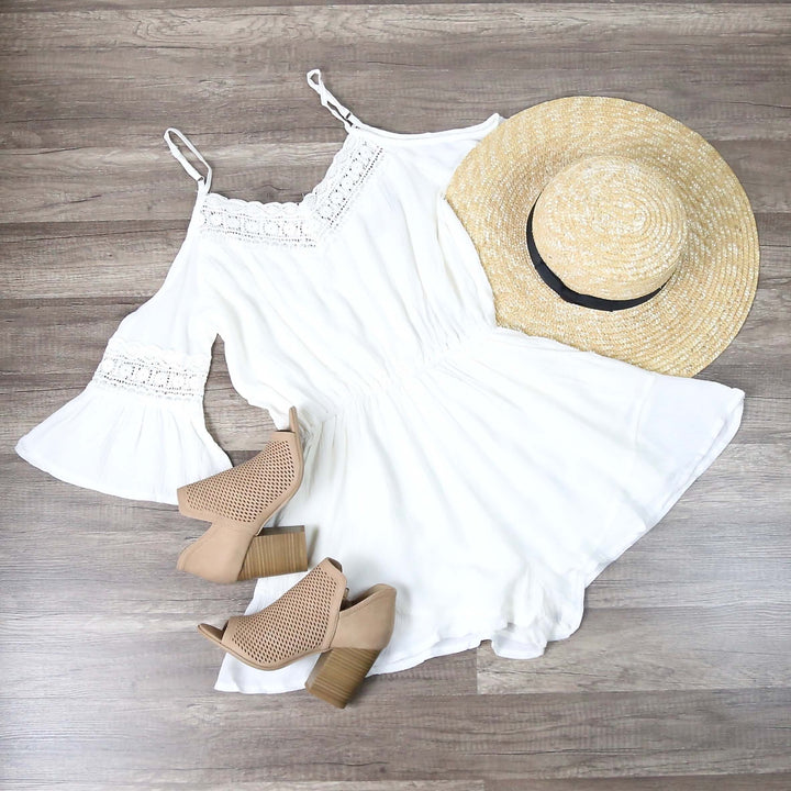 This gypsy warrior romper by wilde heart x madison square clothing is everything you've ever dreamed of and more. Gauzy woven cotton swings from adjustable spaghetti straps to short cold-shoulder sleeves and a triangle bodice, all trimmed in sheer crochet lace. An elasticized waist allows for easy all-day wear, flirty shorts with rounded front pockets. Hidden back zipper. Bodice and shorts are fully lined.