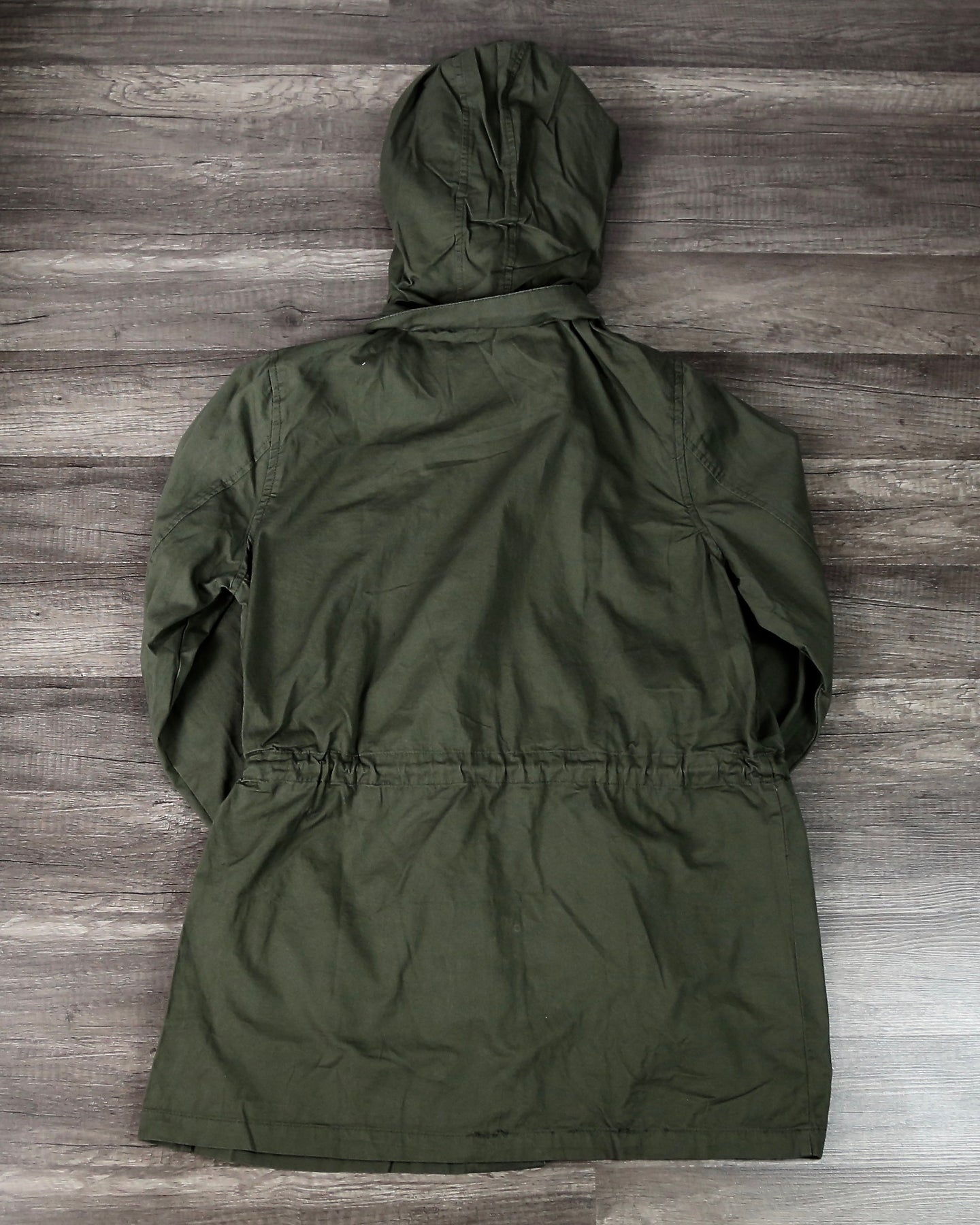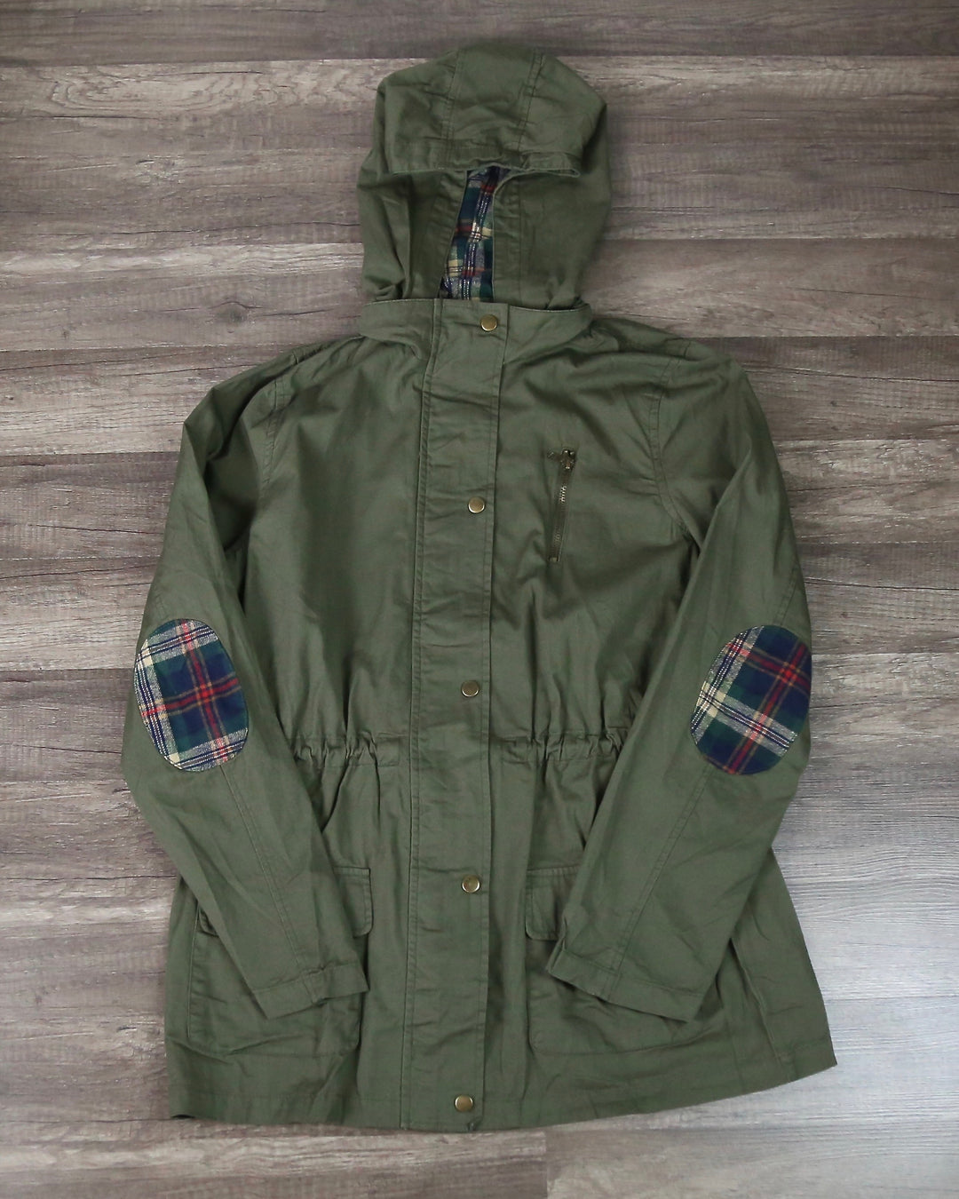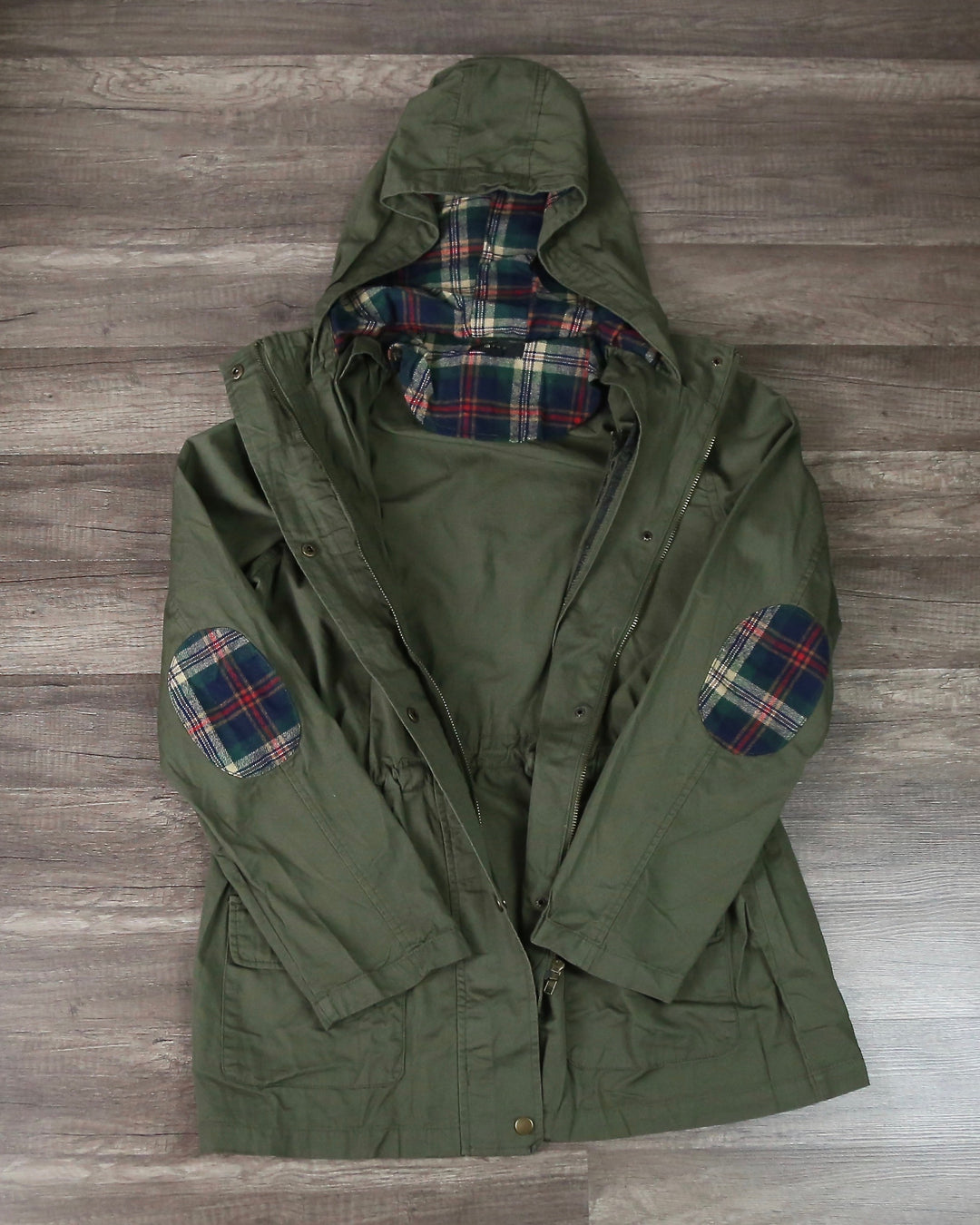 So cute-- love how I can cinch the waist to give a little more shape. The plaid hood and elbow patches are a great contrast. I'm not sure if it was just my long arms but the elbow patches definitely don't hit me at the right spot-- not super noticeable when my arms are straight but you can tell when they're bent!