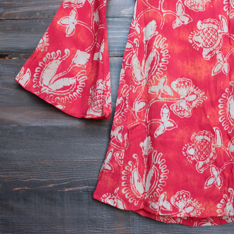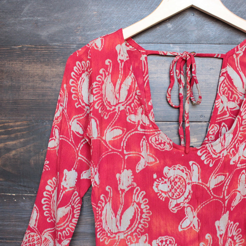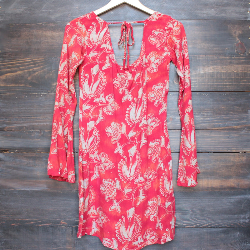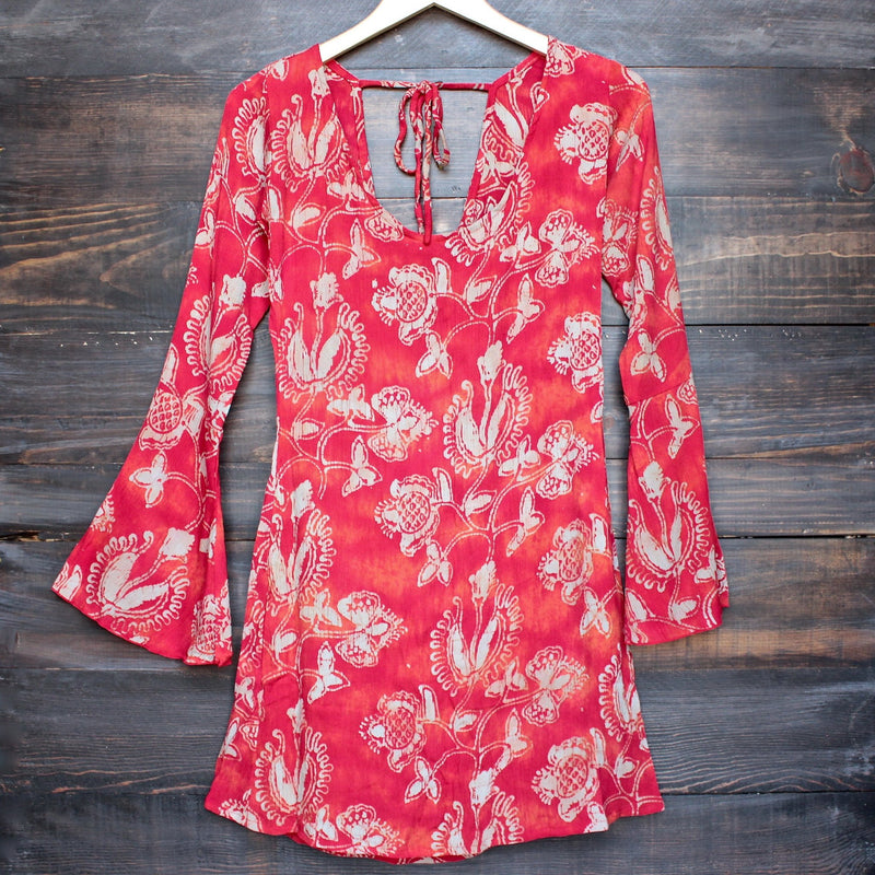 Emily from yireh hawaii does it again with this amazing bell sleeve dress in the print songbird. A vibrant red dress that features bell sleeves and a low cut tie-back.